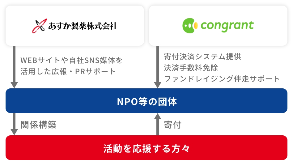 あすか製薬株式会社からはクラウドファンディングのWEBサイトや自社SNS媒体を活用した広報・PRサポート、コングラントからは寄付決済システムの提供・決済手数料の免除・ファンドレイジングの伴走サポートを実施します。