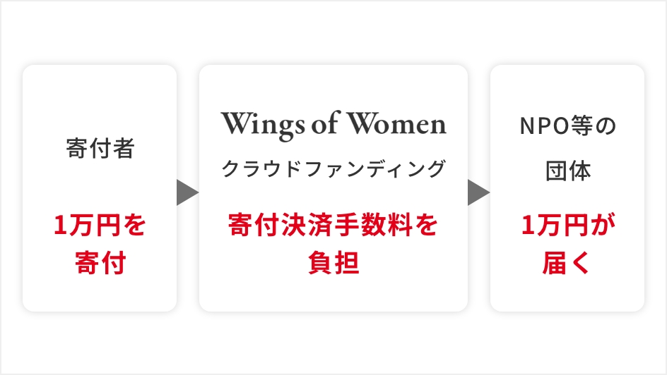 Wings of Women クラウドファンディングでは、対象プロジェクトのクラウドファンディングにかかる寄付決済手数料3.4%~8%*をコングラントが負担することによって、NPO等の団体に支援額の全額が届きます。