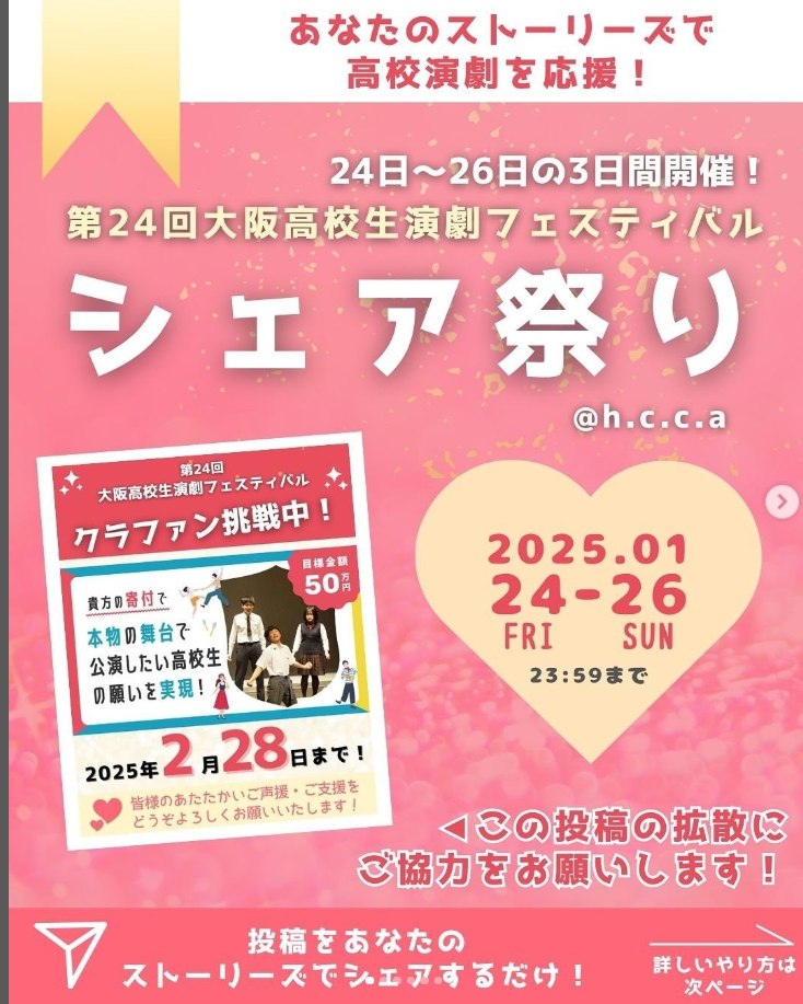 第24回大阪高校生演劇フェスティバルでは現在、高校生演劇の表現を広げ、無事に実施するための金銭的なご協力(1000円~)をいただけるサポーターを募集しておりますが、こういった情報のシェア、拡散にご協力していただける『広報サポーター』も大大大募集しております!