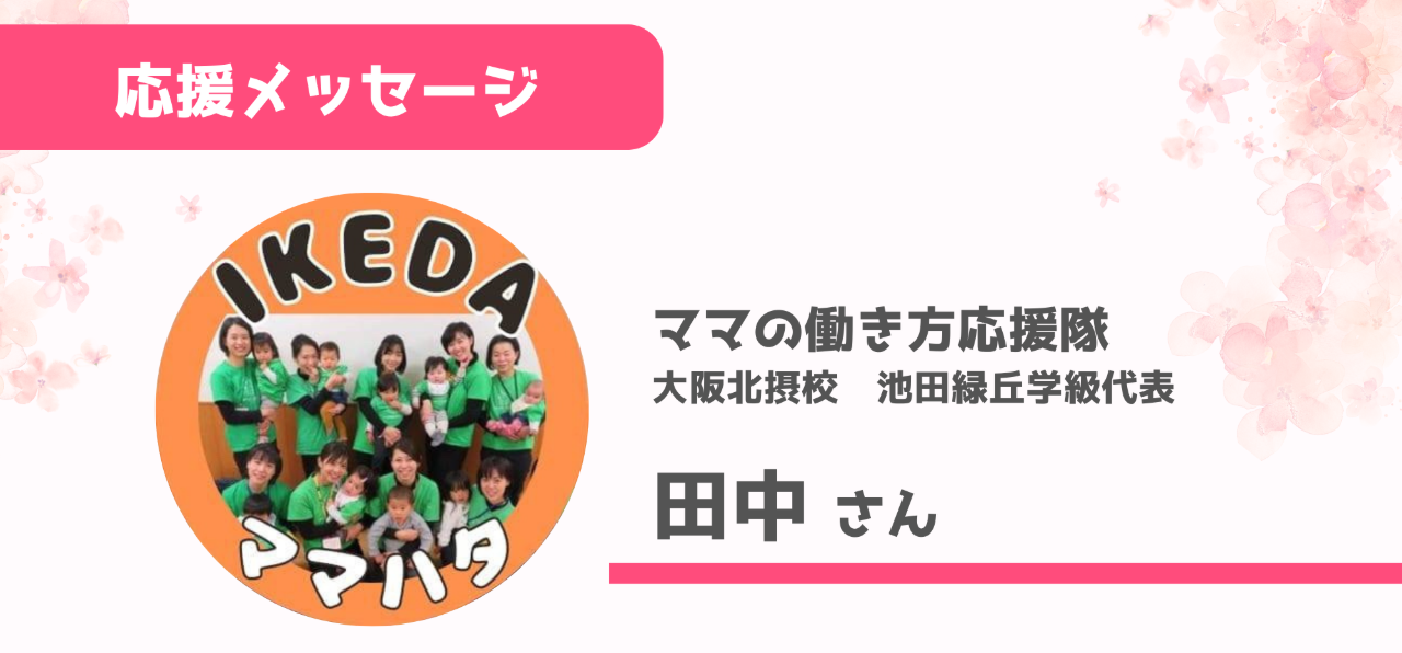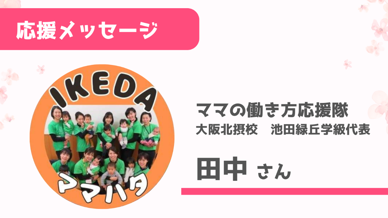 「赤ちゃん先生」や地域でのイベントなどを実施し、ママと社会をつなげる活動を行っている「ママの働き方応援隊 大阪北摂校」池田緑丘学級代表の田中さんより、応援メッセージを頂きました!