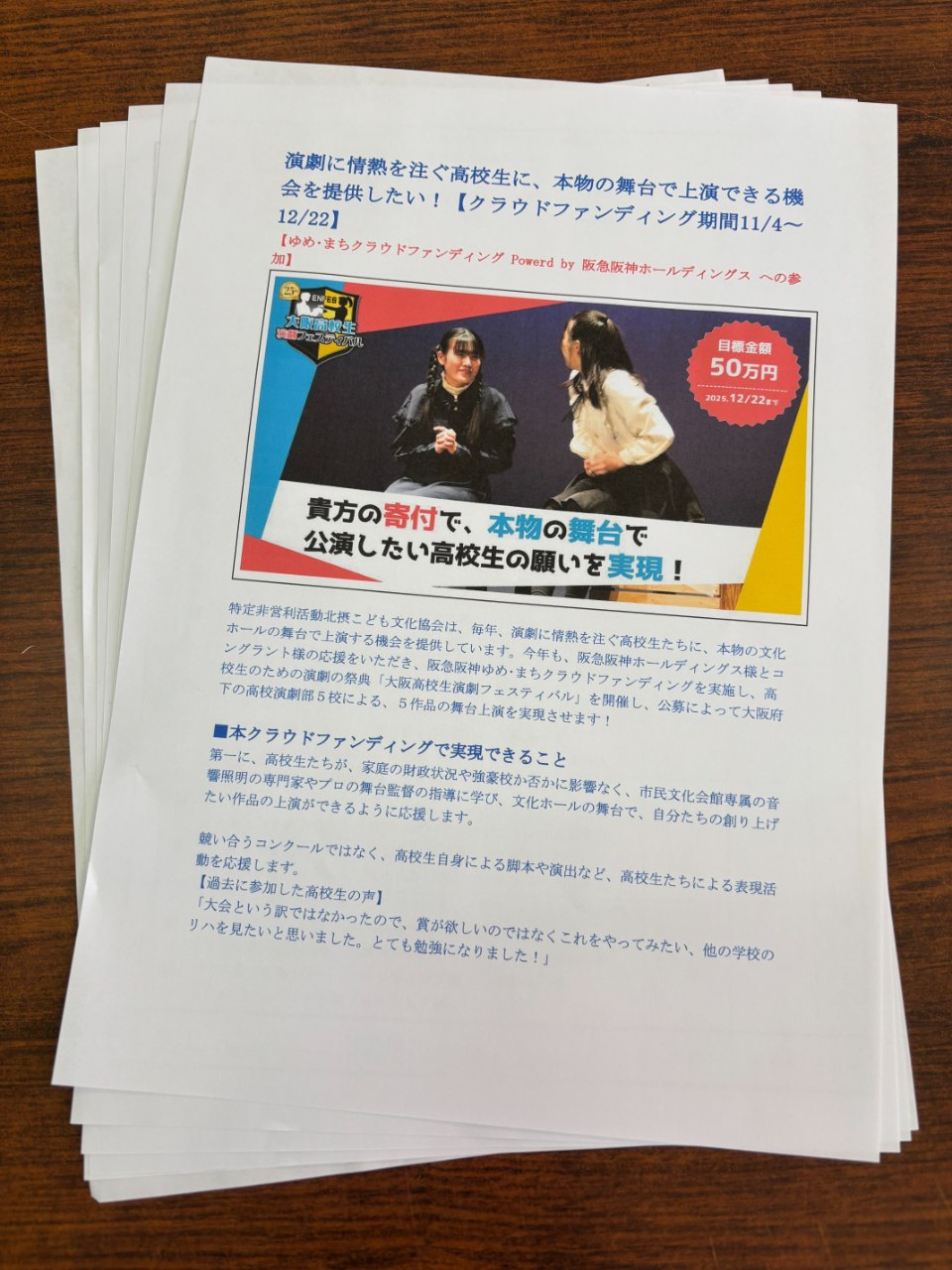 今回の場合は、《阪急阪神ホールディングス様に応援いただき、本クラファンに取りんでいます、大阪高校生演劇フェスティバルを開催します》ということを紹介する文書を「プレスリリース」として、お渡ししに行きました。