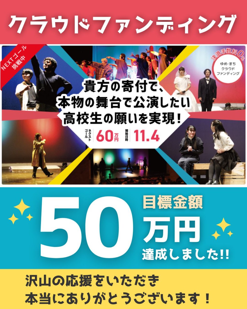 期限3日前に、第25回大阪高校生演劇フェスティバルクラウドファンディング達成率が100%を超え、49名のサポーター様により、【50万円以上】のご支援が集まりました!!