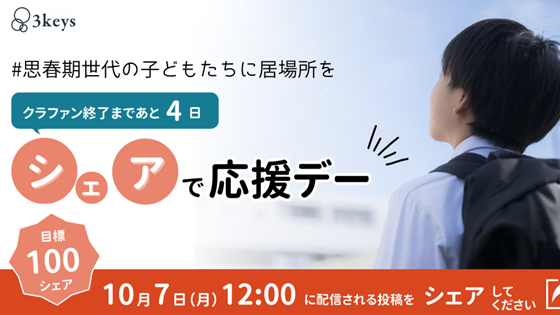 本日(10/7)12:00に3keysの公式Facebookアカウントから発信される投稿を、当日22:00までにシェアしてください。100 シェアを目指します!