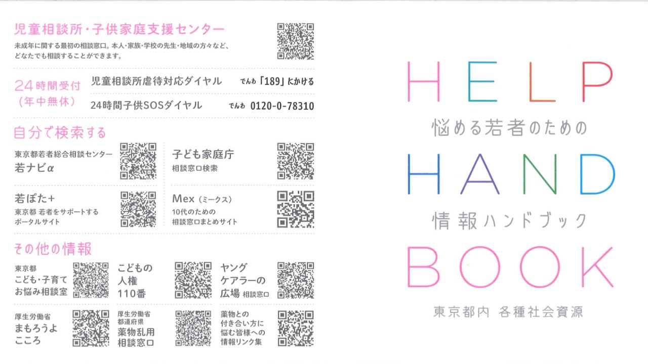 困りごとや苦しさを抱える10代から20代の子ども・若者世代に向けて、友達や家族にも言えない悩みごとや、どうしようもない気持ちを抱いたときに、頼れるかもしれない支援団体や相談場所をまとめたリーフレットです。