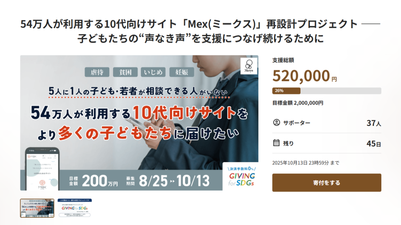 認定NPO法人3keys(スリーキーズ)は、子どもたちが自分で相談先を探せる10代向けサイト「Mex(ミークス)」を運営しています。虐待、貧困、性被害、不登校……。