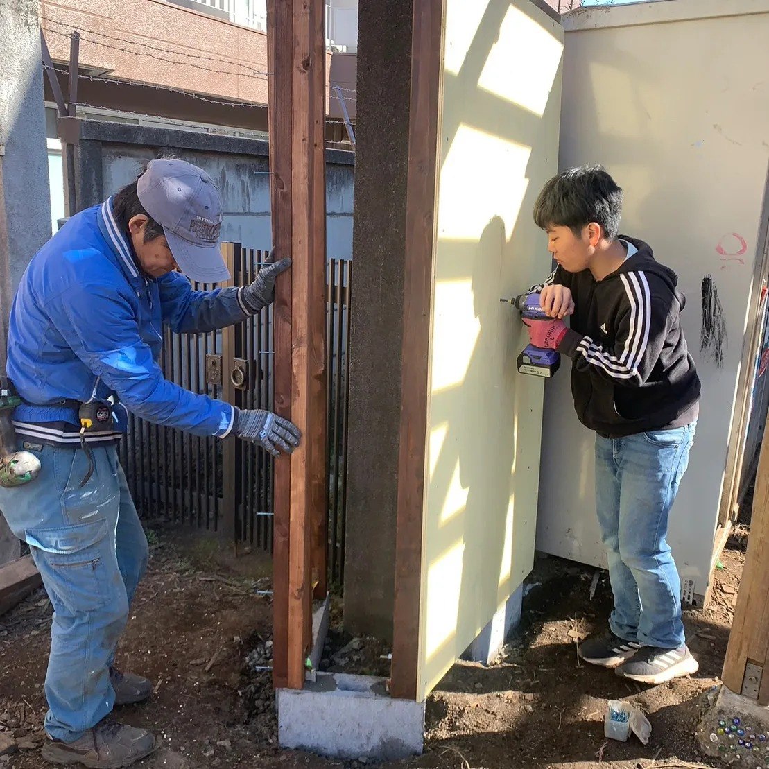 今回は塀をカバーする壁の設置子どもたちがお隣さんの塀を登ってしまうため、塀の手前に木製の壁を作りました