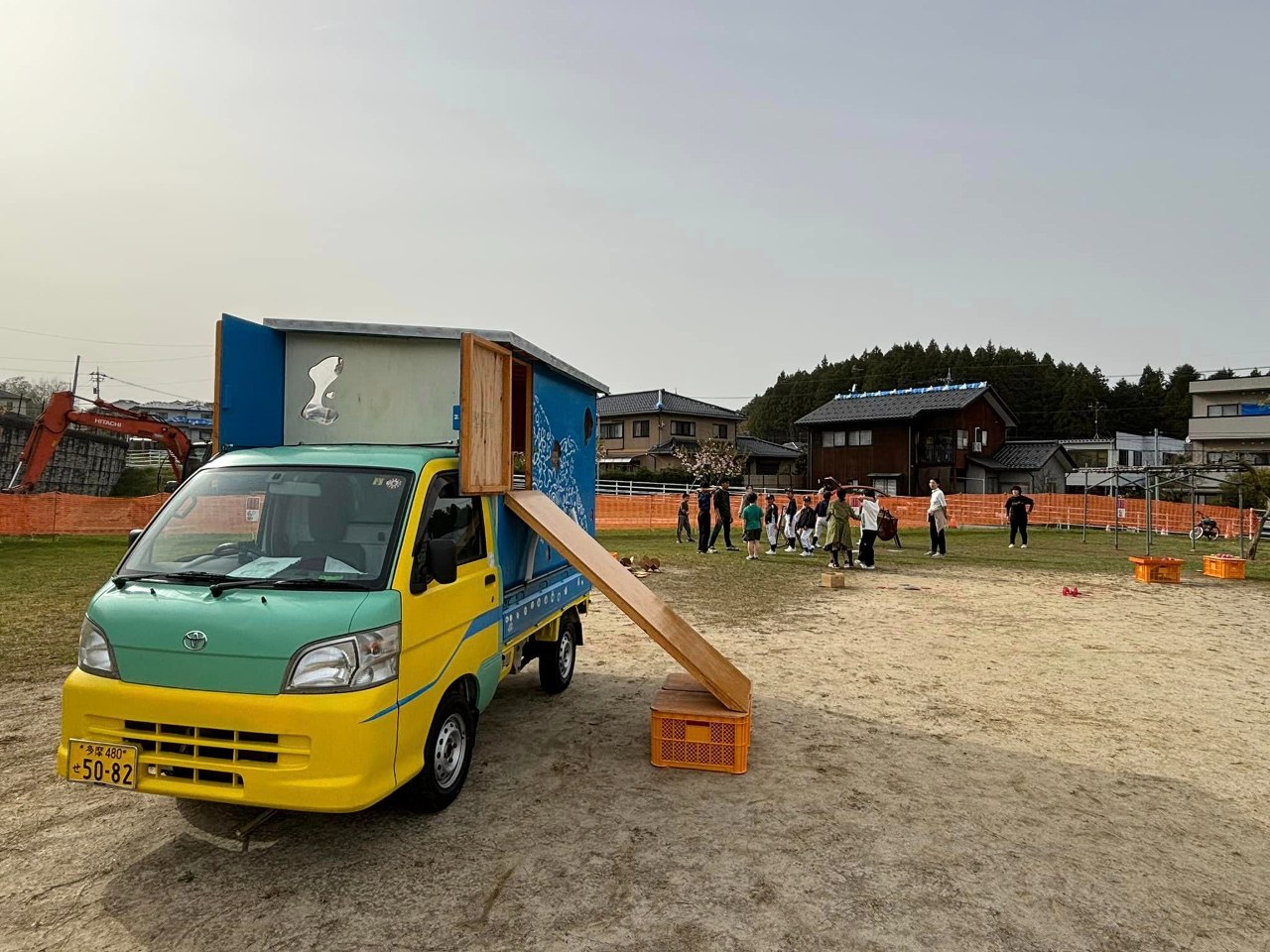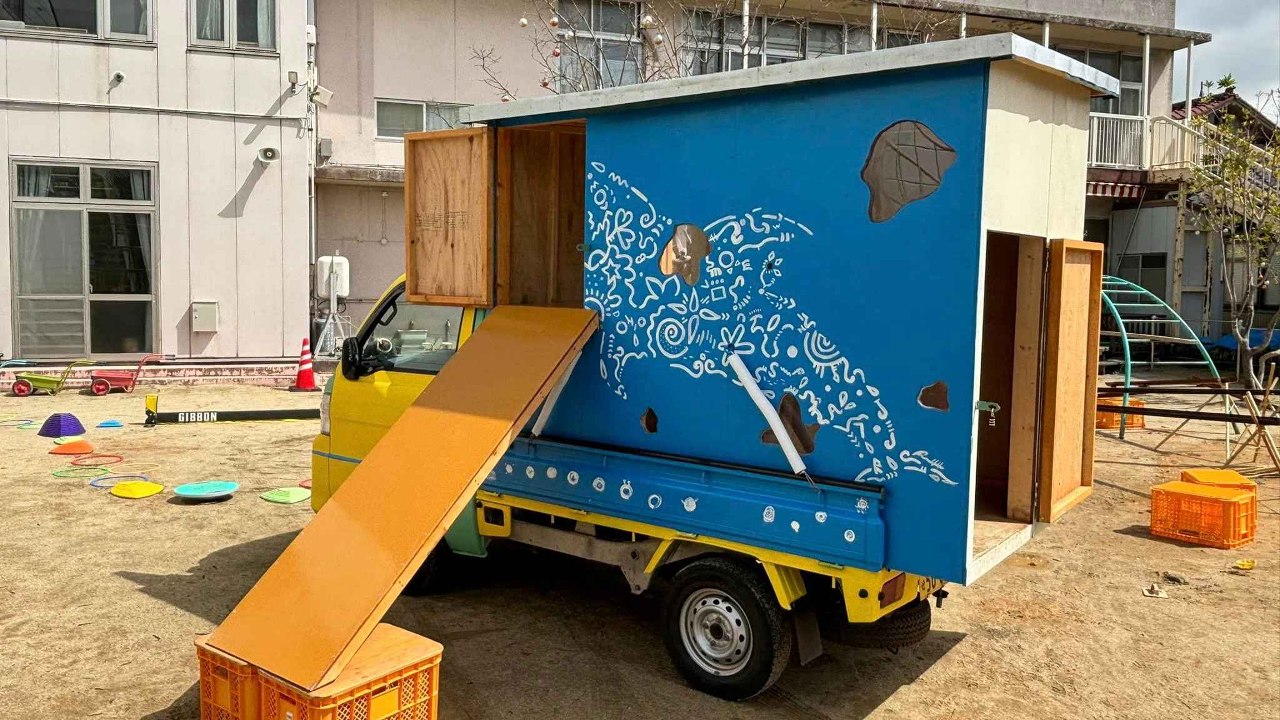 現地でつくったプレーカー「ひょっこりジンベイ号」に乗って、あだっちがあそび場づくりしてきました☆