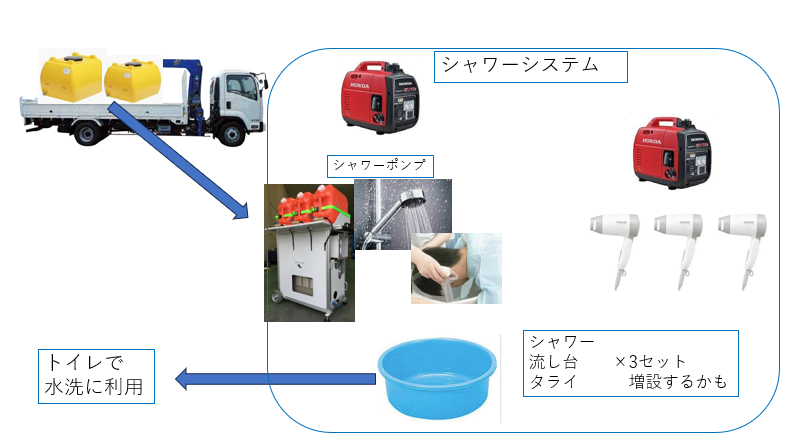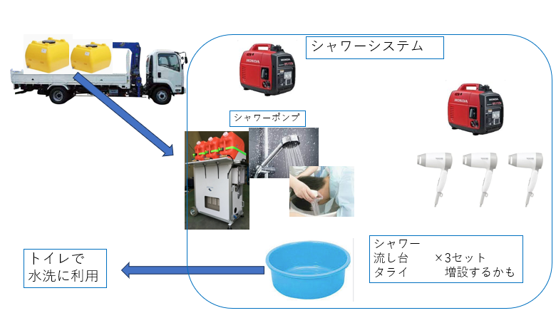 シャワーであれば1人5ℓで洗髪できて、シャワーにつかった洗い湯をタンクに貯めてトイレの水洗に再利用することが可能になり、お風呂の問題もトイレ水洗の問題も同時に解消できることになります。穴水町の、シャワープロジエクトが上手く機能すれば、奥能登の状況が深刻な他の地域でも展開していけるかもしれません。