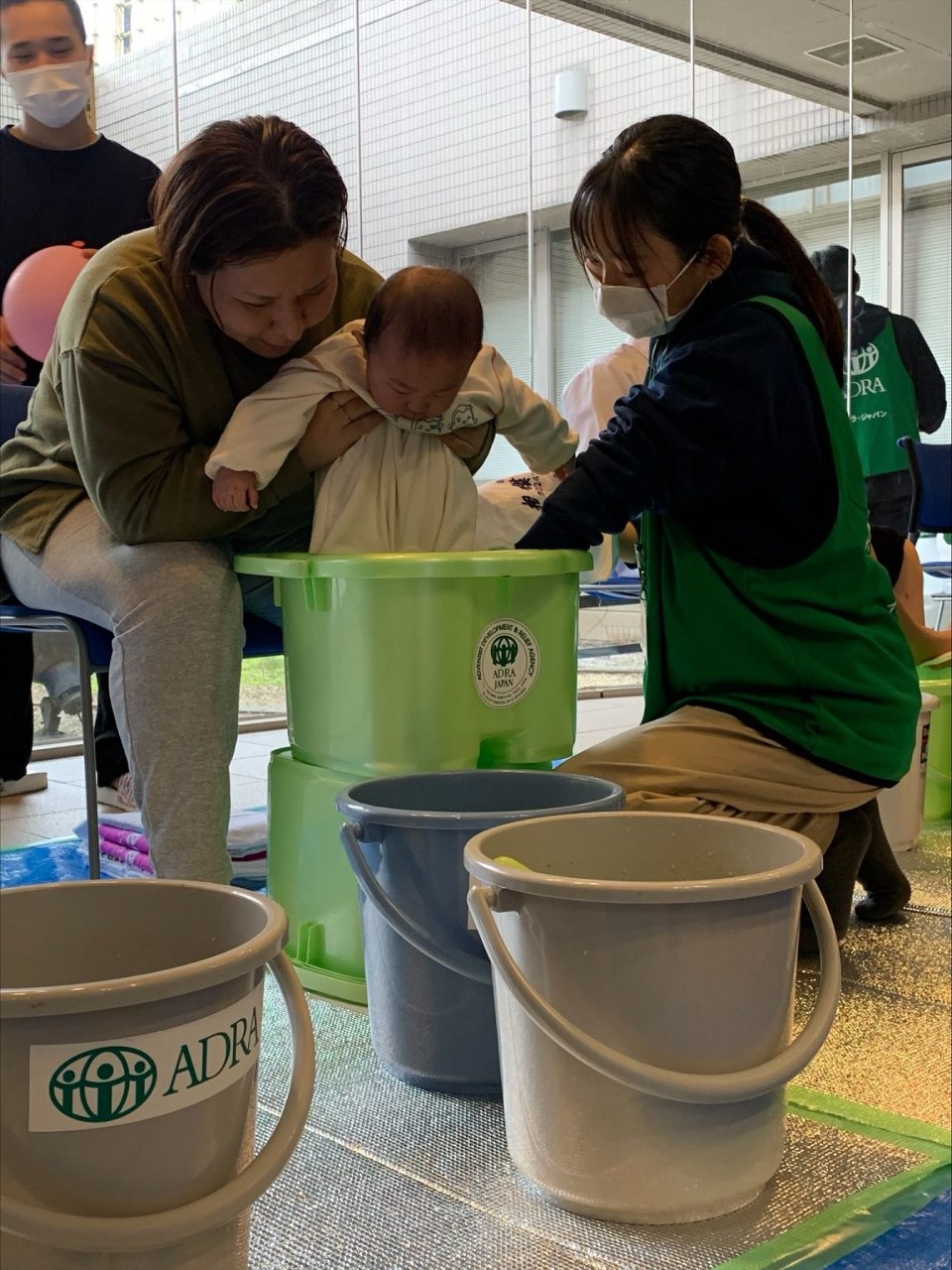 ADRAでは、石川県穴水町でのシャワー提供と並行して、七尾市内で、災害対応バス「ゆあしす号」を使用した移動カフェと足湯の提供を行っています。