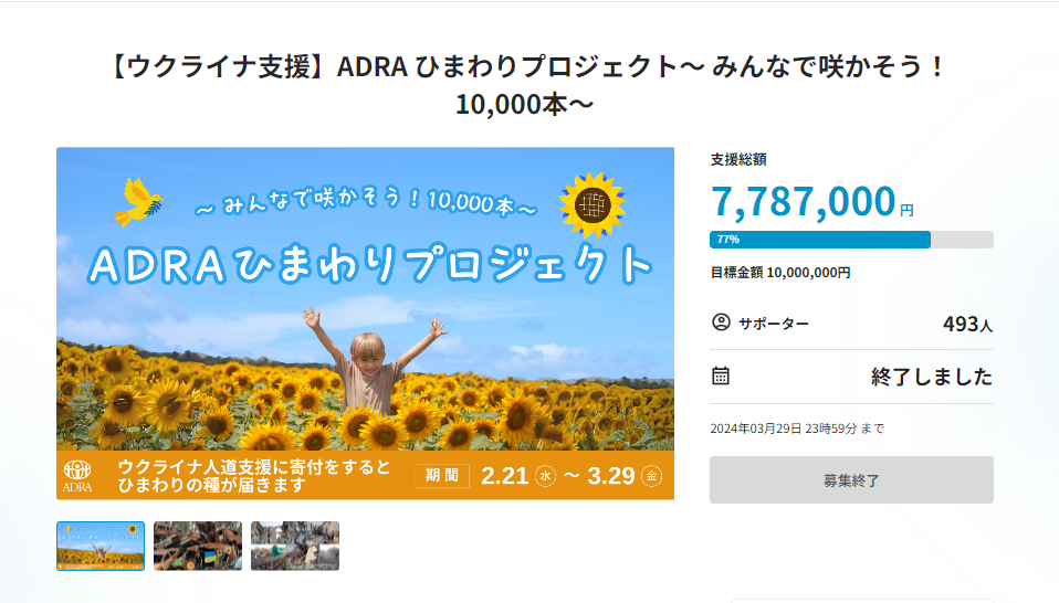 ウクライナ人道支援の必要性が高まってから2年が経ち、メディアの関心が薄れていくことを感じる中、寄付をしてくださった方にひまわりの種を送る「~みんなで咲かそう10,000本~ADRAひまわりプロジェクト」を企画し、参加を募りました。