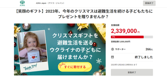 その結果、266名の方が、寄付でサンタクロースになってくださり、目標額の77%を達成することができました。ご寄付とともに、温かいメッセージもたくさんお寄せいただきました。