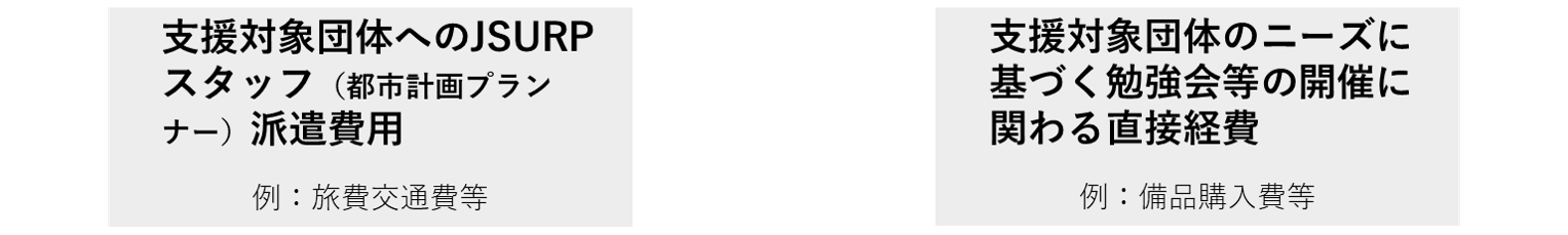 私どもJSURPでは、今般のコロナ禍のなか、新たな社会的課題やニーズに対する取り組みを開始、或いはそれらに対する活動を発展させたいとする意欲あるまちづくり団体を支援する体制を強化します。具体的にはJSURP既存プログラムのひとつである『まちづくり出前講座』の活動量を強化すべく、みなさまのご支援は、以下のような同活動経費に充てさせて頂きたいと考えております。