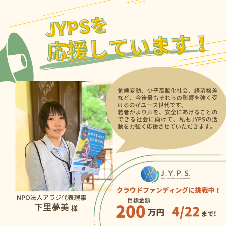 持続可能な社会にむけたジャパンユースプラットフォーム(Japan Youth Platform for Sustainability: JYPS) にて、この度クラウドファンディングを実施します!