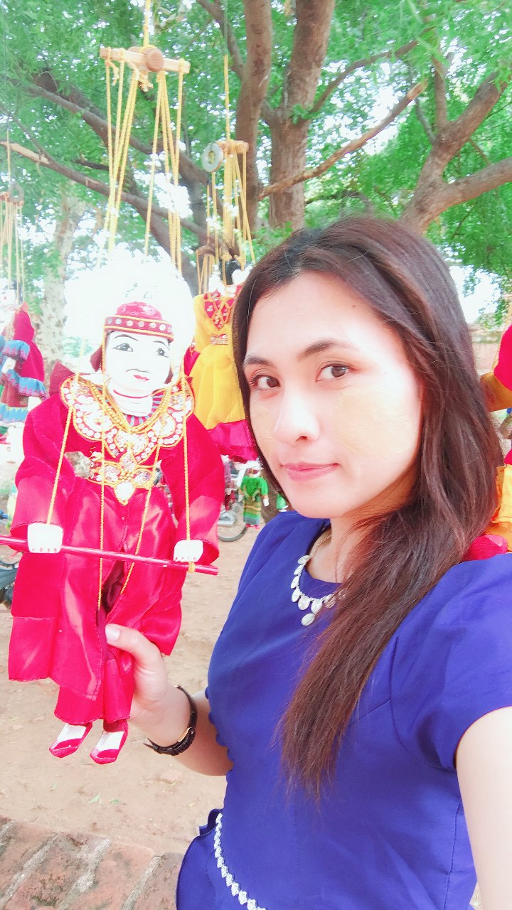 (左)お店に立つレーレーさん(右)ミャンマーの繰り人形「ヨウッテー・ポエー」。世界遺産バガンにて