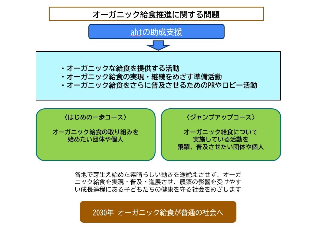 ◆オーガニックシフト部門のオーガニック給食推進助成プログラムでは、オーガニック給食の取り組みを始めたい〈はじめの一歩コース〉と、実施している活動を飛躍・普及させたい〈ジャンプアップコース〉で、幅広い団体および個人の活動を後押しできます。