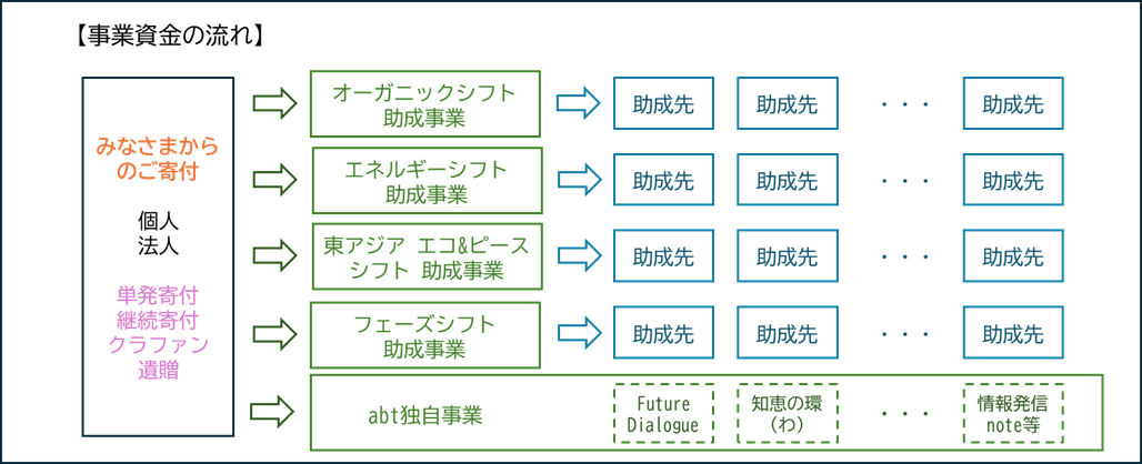 公益社団法人アクト・ビヨンド・トラスト(abt)は、「オーガニックシフト」「エネルギーシフト」「東アジア エコ&ピースシフト」「フェーズシフト」の4部門を柱に、自然環境と人間生活の調和をめざした市民活動を支援する独立の民間基金です。