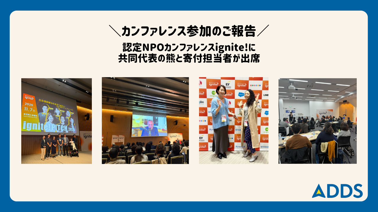 2025-11-21 16:30カンファレンス参加のご報告==認定NPOカンファレンスignite! 「社会課題解決をあきらめない」認定NPOカンファレンスignite (2025年11月7日・8日)==== オープニングでは、非営利セクターを牽引するDan Pallotta氏が登壇し、著書『Uncharitable』を背景に、寄付文化の潮流や大きな目標に挑戦する大切さを伝えてくださいました。続くピッチコンテストでは6つの団体が社会課題への思いを熱く語り、会場全体がNPOの原点に立ち返るような力強い時間となりました。午後の分科会でも多様なテーマで活発な議論が行われ、多くの気づきを得ることができました。 2日目は、オーストラリアの歴史あるNPO「The Smith Family」のLouise Woods氏による特別講演が行われ、時代に合わせて進化してきた活動の歩みから多くの学びをいただきました。その後のワールドカフェ形式のワークでは、参加団体の皆様と100年後の自団体の姿を想像しながら有意義な対話ができました。2025-11-21 16:30カンファレンス参加のご報告==認定NPOカンファレンスignite! 「社会課題解決をあきらめない」認定NPOカンファレンスignite (2025年11月7日・8日)==== オープニングでは、非営利セクターを牽引するDan Pallotta氏が登壇し、著書『Uncharitable』を背景に、寄付文化の潮流や大きな目標に挑戦する大切さを伝えてくださいました。続くピッチコンテストでは6つの団体が社会課題への思いを熱く語り、会場全体がNPOの原点に立ち返るような力強い時間となりました。午後の分科会でも多様なテーマで活発な議論が行われ、多くの気づきを得ることができました。 2日目は、オーストラリアの歴史あるNPO「The Smith Family」のLouise Woods氏による特別講演が行われ、時代に合わせて進化してきた活動の歩みから多くの学びをいただきました。その後のワールドカフェ形式のワークでは、参加団体の皆様と100年後の自団体の姿を想像しながら有意義な対話ができました。