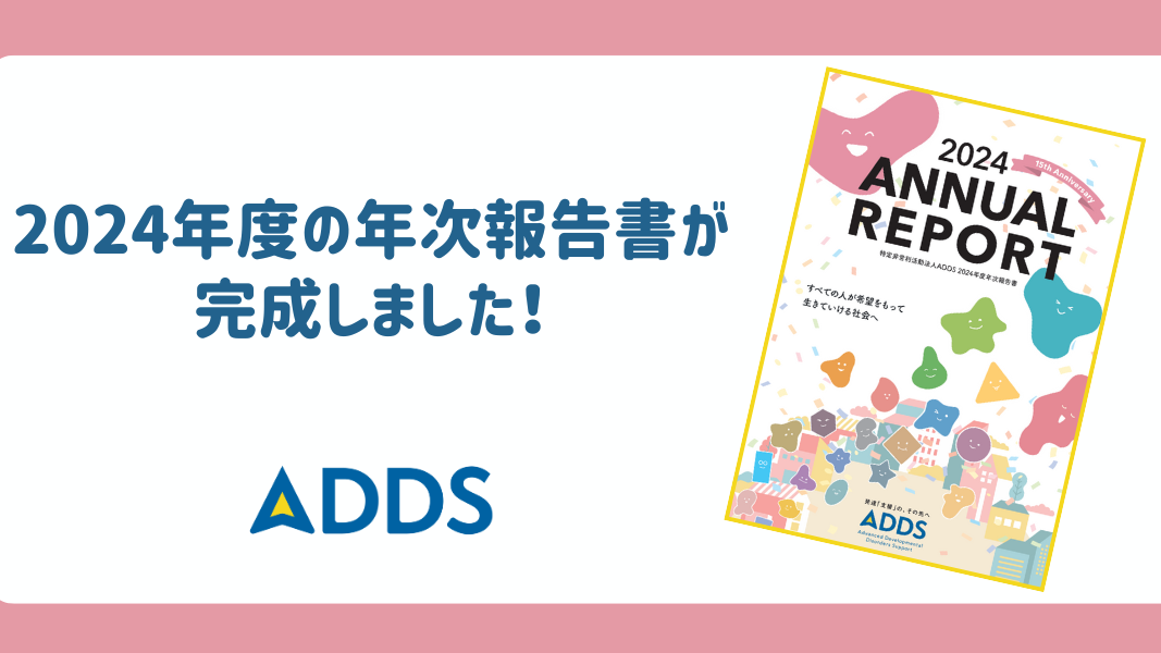 2025-10-07 12:00【24年度年次報告書が完成!】本日からサポーター様向けに順次郵送しますADDSが設立15周年を迎えたことを記念して製作させていただいた2024年度年次報告書が完成しました。=================== ●900名を超える保護者アンケート結果のご紹介 ●ADDS15年の軌跡&今のADDS大解剖! ●研究・実践両面で多大なサポートを下さっている慶応義塾大学名誉教授の山本淳一先生、創業時に保護者そして経営のダブルの観点から支えて下さった 丹野 優 さんのインタビュ ●現場をのぞけるミニクイズ =================== など、学生時代を含めると20年余りになる私たちの活動を是非皆様にお伝えできればという思い出制作しました。 早速今週から、寄付者の皆様に向けて順次郵送させていただきますので、お手元に届くまで今しばらくお待ちくださいませ。2025-10-07 12:00【24年度年次報告書が完成!】本日からサポーター様向けに順次郵送しますADDSが設立15周年を迎えたことを記念して製作させていただいた2024年度年次報告書が完成しました。=================== ●900名を超える保護者アンケート結果のご紹介 ●ADDS15年の軌跡&今のADDS大解剖! ●研究・実践両面で多大なサポートを下さっている慶応義塾大学名誉教授の山本淳一先生、創業時に保護者そして経営のダブルの観点から支えて下さった 丹野 優 さんのインタビュ ●現場をのぞけるミニクイズ =================== など、学生時代を含めると20年余りになる私たちの活動を是非皆様にお伝えできればという思い出制作しました。 早速今週から、寄付者の皆様に向けて順次郵送させていただきますので、お手元に届くまで今しばらくお待ちくださいませ。