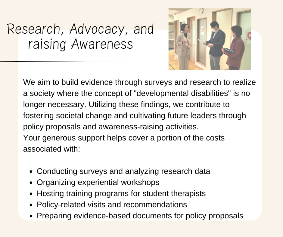 Towards the realization of a society where the concept of "developmental disoeders" is unnecessary, we build evidence through surveys and research. Utilizing these findings, we engage in policy proposals and awareness-raising activities, contributing to the development of future leaders and fostering societal change.