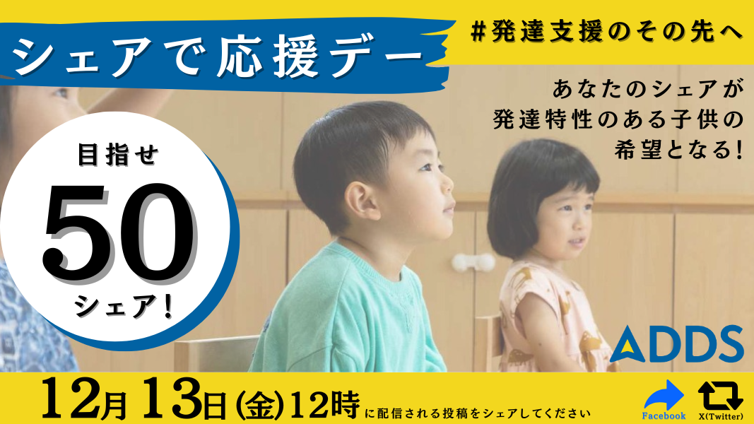 12月13日(金)12時にADDSのFacebook, X(旧Twitter)にて配信される投稿を、同日深夜までにシェア・リポストしてください!2つのSNSのシェア・リポスト数「50」を目指しています!
