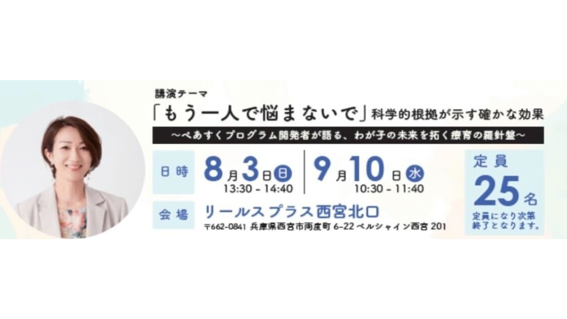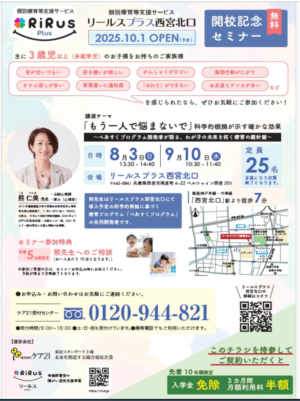 【共同代表 熊 登壇のお知らせ】兵庫県西宮市RiRus Plus開校記念セミナー 8/3&9/10