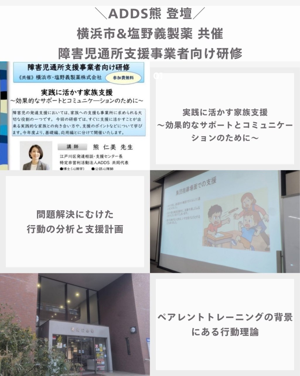 ADDS共同代表の熊が講師を務めさせていただき3年目となります。今年は、基礎編・応用編の2回シリーズを実施し、50名程度ご参加下さいました。講義に加えて、実践形式で支援者への学びを提供させていただきました。