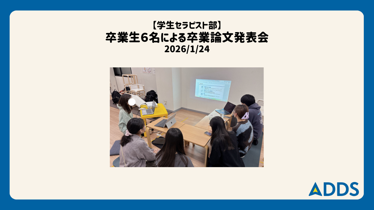 学生時代の貴重な時間を使って、ADDS学生セラピスト部での活動に参加してくださり、誠にありがとうございました!4月以降は、それぞれの進路で活躍の場をもつ皆さまを、これからも心より応援しています!またご一緒に活動できる日が来ること、心から楽しみにしています!