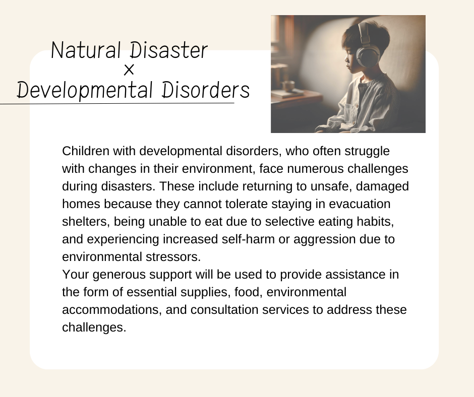 There are many parents and children in disaster-affected areas who require developmental support. Similarly, children facing developmental challenges are present in economically disadvantaged households, among foreign residents in Japan, and even among those struggling with school absenteeism.