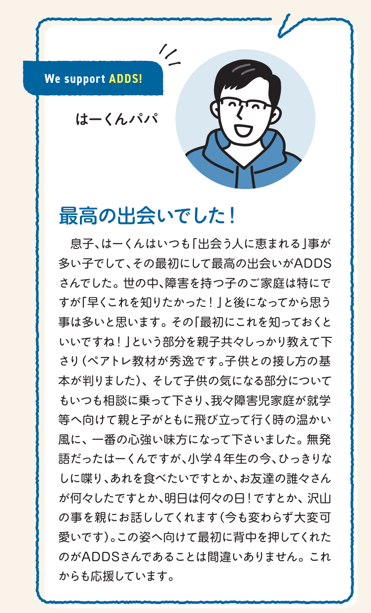 Although Ha-kun was non-verbal, he's now a cheerful 4th grader who talks about what he wants to eat, his friends, and even remembers upcoming events like "Tomorrow is Mountain Day!" This transformation wouldn’t have been possible without ADDS, who supported us from the very beginning. I'm proud to continue supporting ADDS and their invaluable work.