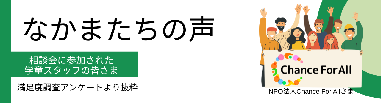 私たちの活動を応援してくださっている寄付者さまや、発達支援現場ではなく学童の現場においてインクルーシブな環境を備えるため継続的に研修相談会を受講してくださっている方々のお声をご紹介します。