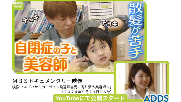 2026-02-05 12:00【メディア出演】MBS映像24『ハサミのミライ~発達障害に寄り添う美容師』YouTube公開スタートMBSによるドキュメンタリー番組「映像’24」で2024年9月29日に放送された弊団体竹内出演の回がこの度YouTubeにて公開スタートしました。======『ハサミのミライ~発達障害に寄り添う美容師』======本編では美容師として活動されている赤松隆滋さんが、応用行動分析(ABA)を用い発達障害のあるお子様にヘアカットを施している様子や、実際のカットに至るまでの取り組みについて紹介しています。=======詳細及びYouTube動画へのリンクは「続きを読む」を押してください↓2026-02-05 12:00【メディア出演】MBS映像24『ハサミのミライ~発達障害に寄り添う美容師』YouTube公開スタートMBSによるドキュメンタリー番組「映像’24」で2024年9月29日に放送された弊団体竹内出演の回がこの度YouTubeにて公開スタートしました。======『ハサミのミライ~発達障害に寄り添う美容師』======本編では美容師として活動されている赤松隆滋さんが、応用行動分析(ABA)を用い発達障害のあるお子様にヘアカットを施している様子や、実際のカットに至るまでの取り組みについて紹介しています。=======詳細及びYouTube動画へのリンクは「続きを読む」を押してください↓