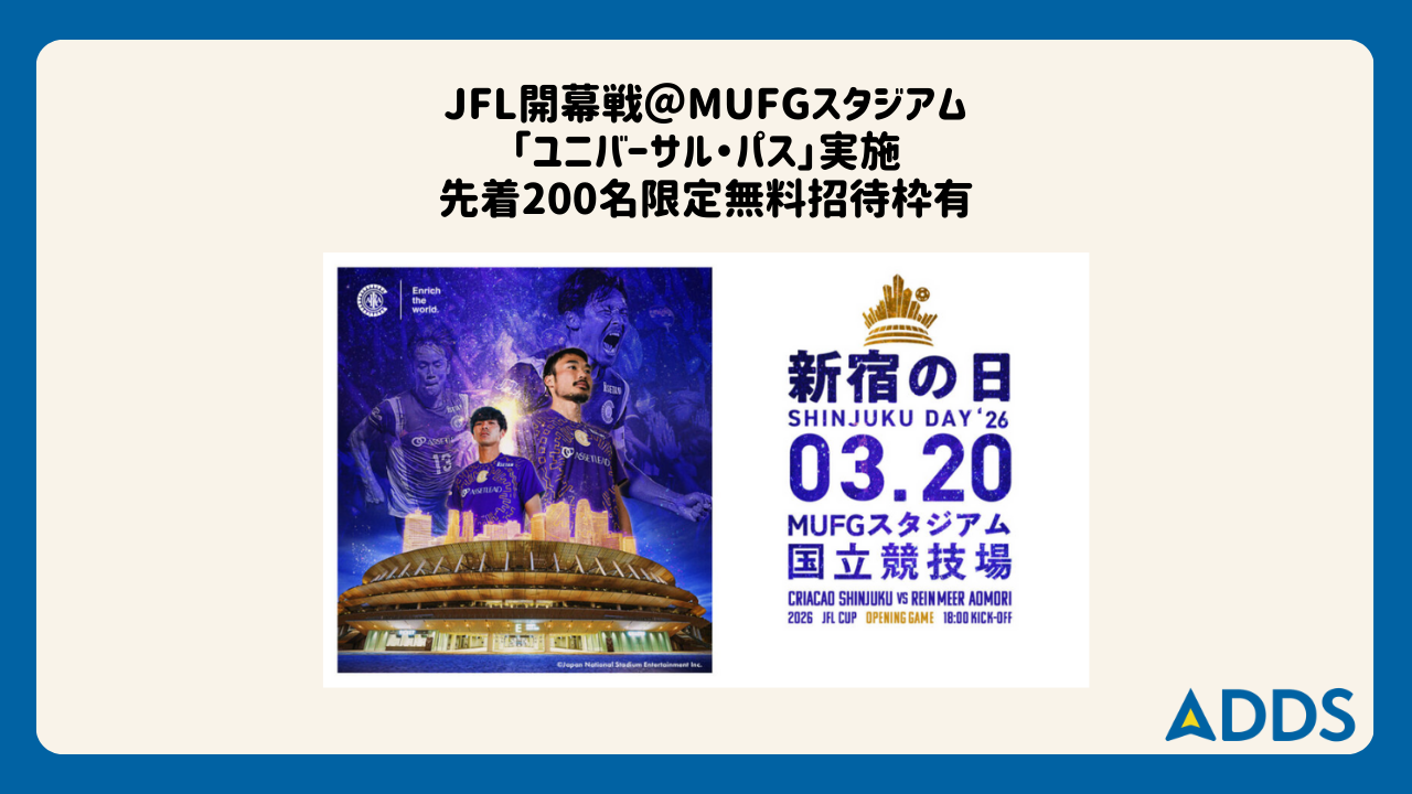 2026-02-13 12:003/20 JFL開幕戦@MUFGスタジアム 「ユニバーサル・パス」実施ー先着200名限定無料招待枠有クリアソン新宿は、2026年3月20日(金)に予定されているJFL CUP開幕戦を行うMUFGスタジアム(国立競技場)において、障がいの有無を問わず誰もが安心してスポーツ観戦を楽しめる取り組み「ユニバーサル・パス」を実施することを決定いたしました。障がいのある方、およびその介助者・同行者を対象とした無料招待枠を先着200名様にご用意しています。ADDSは、パートナー団体として当日会場におけるサポートを実施します。===詳細及びお申込みは「続きを読む」へ2026-02-13 12:003/20 JFL開幕戦@MUFGスタジアム 「ユニバーサル・パス」実施ー先着200名限定無料招待枠有クリアソン新宿は、2026年3月20日(金)に予定されているJFL CUP開幕戦を行うMUFGスタジアム(国立競技場)において、障がいの有無を問わず誰もが安心してスポーツ観戦を楽しめる取り組み「ユニバーサル・パス」を実施することを決定いたしました。障がいのある方、およびその介助者・同行者を対象とした無料招待枠を先着200名様にご用意しています。ADDSは、パートナー団体として当日会場におけるサポートを実施します。===詳細及びお申込みは「続きを読む」へ
