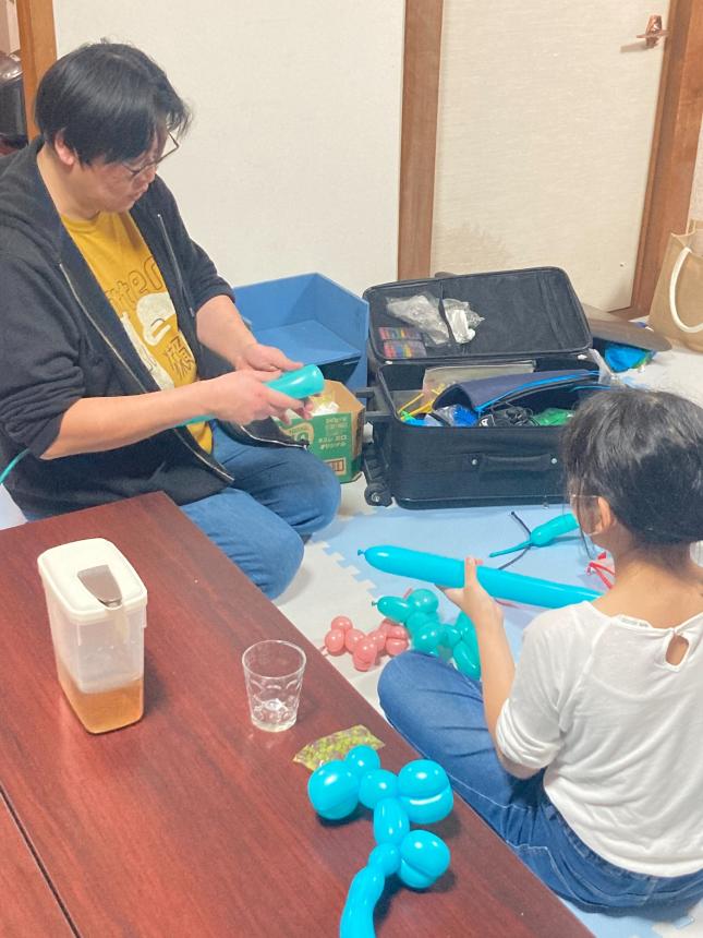 食べ終わった後は、風船で遊んでいる子どもにバルーンを教えて、バルーン教室となりました。