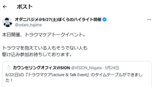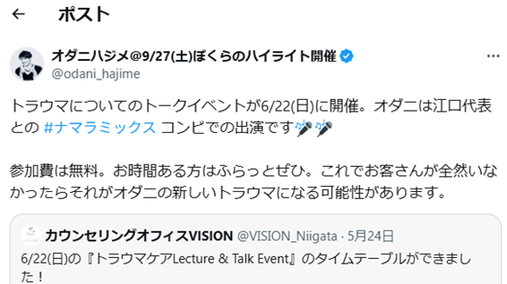 - 2025-05-04 09:55江口代表とオダニハジメさんとのトークイベントです!江口代表とオダニハジメさんとのトークイベントです! 今までトラウマ(心的外傷)について全然知らなかった方にもお気軽に楽しくお聞き頂けます!ぜひどうぞ!2025-05-04 09:55江口代表とオダニハジメさんとのトークイベントです!江口代表とオダニハジメさんとのトークイベントです! 今までトラウマ(心的外傷)について全然知らなかった方にもお気軽に楽しくお聞き頂けます!ぜひどうぞ!