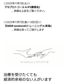 トラウマの症状に悩まされる人が数多くいます。NPO法人新潟トラウマ治療協会では『すべての人にトラウマケアを』を理念とし、トラウマ治療を受けたいが経済的余裕のない人への治療費補助、トラウマ治療に関する講演・研修、トラウマ治療の周知・普及・広報・キャンペーン、トラウマ治療に関する研究、などの活動を行っています。