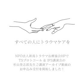 NPO法人新潟トラウマ治療協会のHPで11/1(土)のTSプロトコール&IFS講演会の動画をお申込み頂けます! https://npotraumatreatment.com... お申込みには1000円以上のご寄付をお願いします