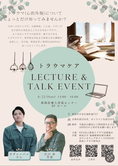 それが今回の『トラウマケアLecture & Talk Event』に、江口歩代表とオダニハジメさんにご出演頂けることにも繋がりました