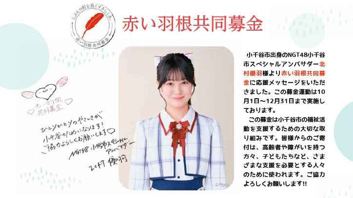〇小千谷市出身の『小千谷市スペシャルアンバサダー NGT48 北村優羽様』より小千谷市の赤い羽根共同募金に応援メッセージをいただきました♥