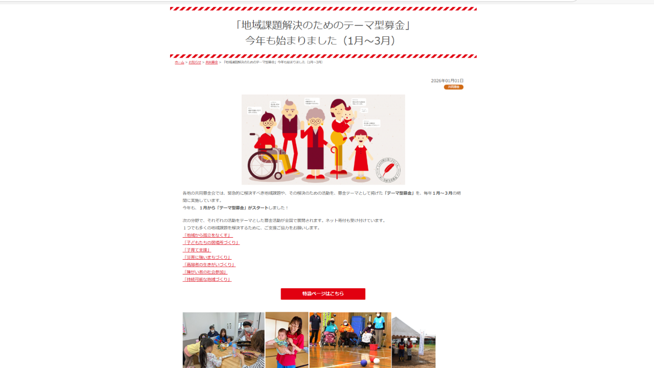 2026-02-06 23:25中央共同募金会 テーマ型募金のトップページに写真が掲載されました!なんと!! 全国の赤い羽根共同募金会のプロジェクト紹介トップページに 当会の写真が掲載されています!2026-02-06 23:25中央共同募金会 テーマ型募金のトップページに写真が掲載されました!なんと!! 全国の赤い羽根共同募金会のプロジェクト紹介トップページに 当会の写真が掲載されています!