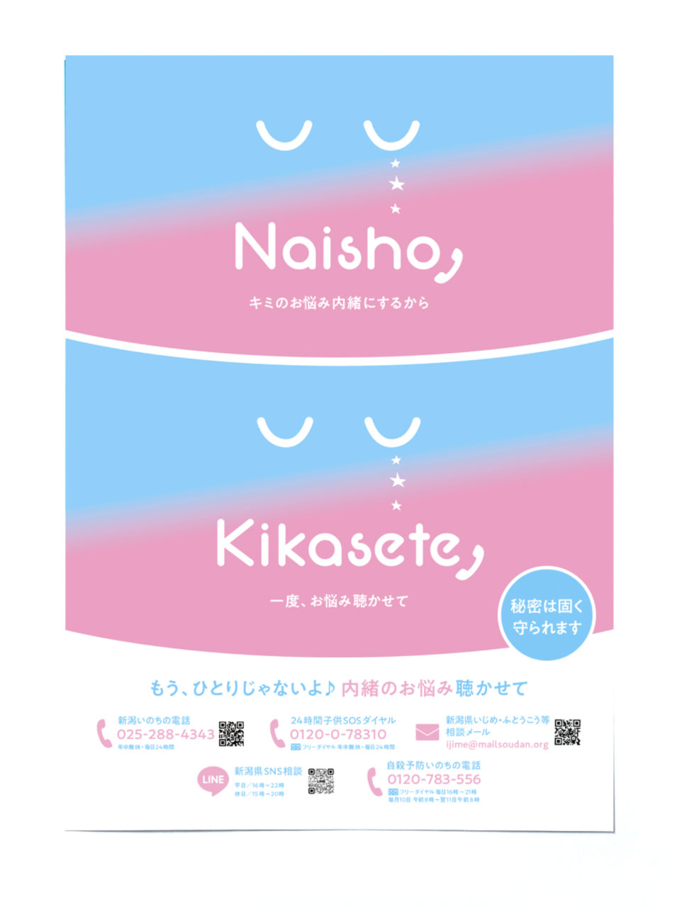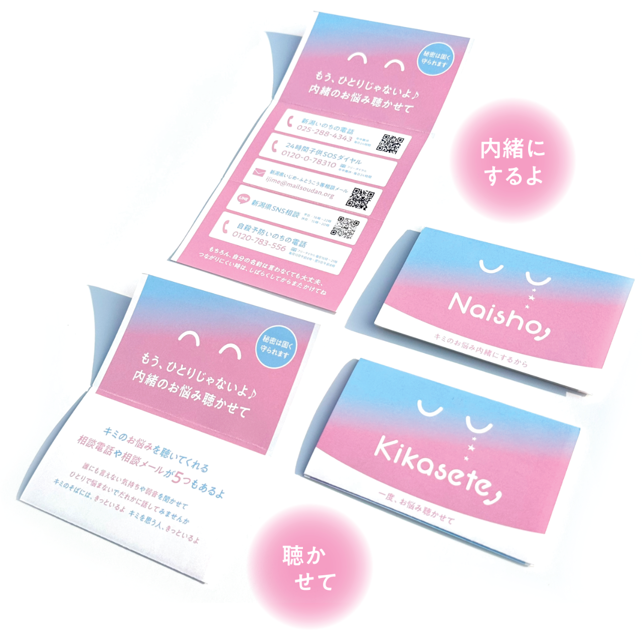 そうは言っても、悩みを話すことは勇気が必要です。だからこのカードには自分の名前を言わなくても話せる相談先を載せています。「聴かせて」という思いを中学生に伝えるために、新発田市在住のアートディレクター松田英幸さんとカードを作りました。若い人には苦手と言われる電話ですが、顔が見えない電話相談の聞き手には、正直な自分の気持ちを話せるかもしれません。