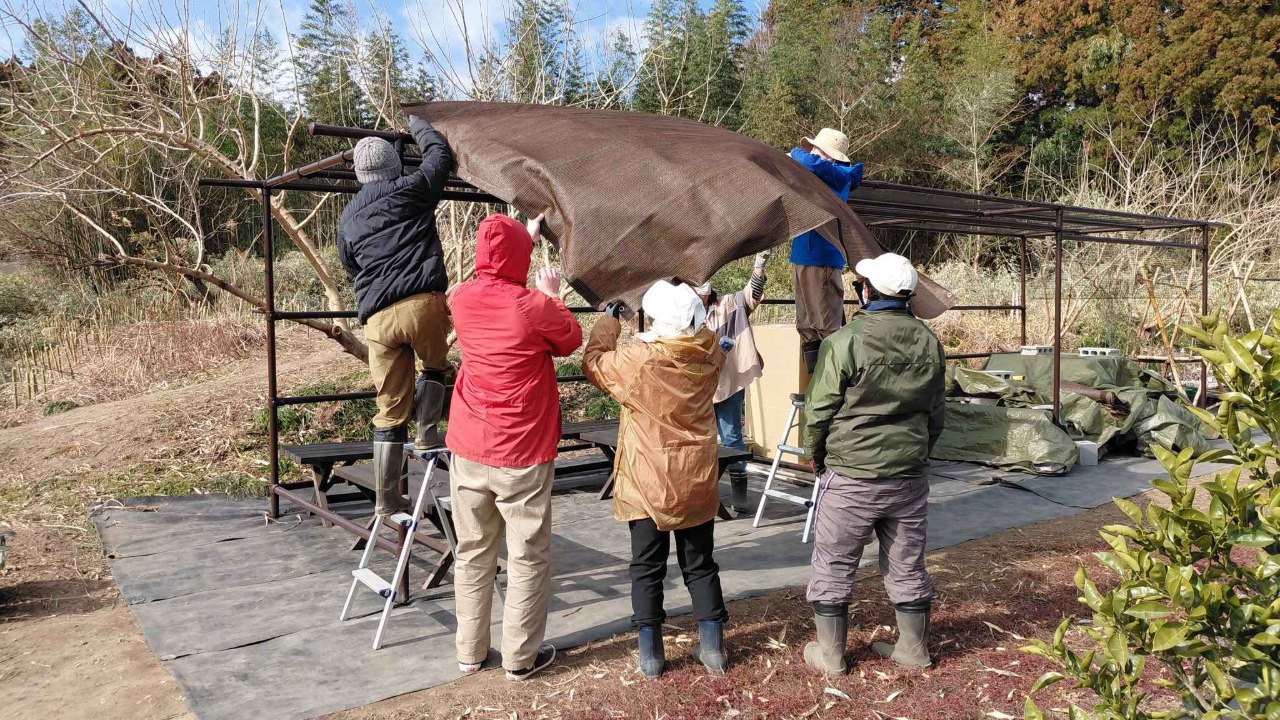 現在私たちにできることは、春からの活動準備を万全に整えることです。本日は、皆さんが気持ちよく過ごせるよう、暑さ対策や急な雨に備えて単管パイプのパーゴラに遮光シートをかけました。 作業には「就労継続支援B型事業所 アップルファーム亘理」の皆さんも参加してくださり、笑顔あふれる楽しい時間となりました。