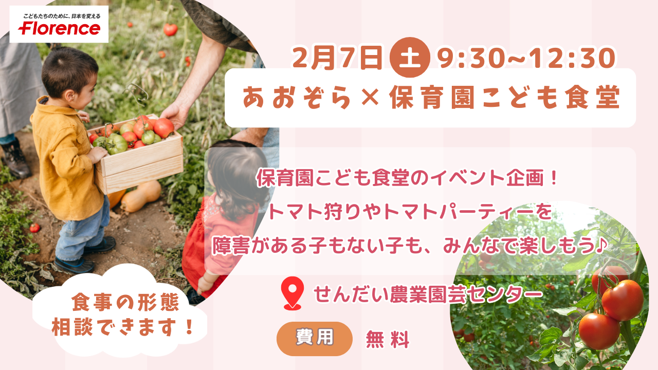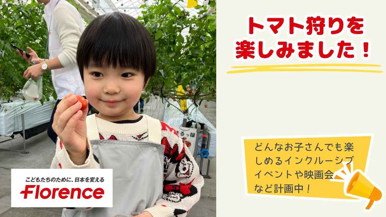 2026-01-15 16:392026年スタート!2月のイベントはトマトが主役!&医ケア児映画会の準備始まります。今年も多くのご家庭に笑顔を届けるため、着々と準備を進めています。 ①【2/7(土)開催】あおぞら✕保育園こども食堂 障害の有無に関わらず誰でも楽しめるインクルーシブイベントを実施します。 今回のメインは『トマト』!みんなでピザを作ります♪ (前回の様子: https://florence.or.jp/news/79583/ ) ②医ケア児おやこ映画会 毎年いろんなご家族の映画館デビューを応援している本企画。 家族みんなで体験することもスペシャル。特別な思い出作りを目指します! (昨年の様子: https://florence.or.jp/news/85069/ ) 宮城だけでなく、東京オフィスでもチラシを設置。支援を呼びかけ中です! これまでのご支援で、現在映画会1回分の鑑賞料を無料にできる見込みです。 また、SNSでのシェアも大きな励みになります。引き続きよろしくお願いいたします!2026-01-15 16:392026年スタート!2月のイベントはトマトが主役!&医ケア児映画会の準備始まります。今年も多くのご家庭に笑顔を届けるため、着々と準備を進めています。 ①【2/7(土)開催】あおぞら✕保育園こども食堂 障害の有無に関わらず誰でも楽しめるインクルーシブイベントを実施します。 今回のメインは『トマト』!みんなでピザを作ります♪ (前回の様子: https://florence.or.jp/news/79583/ ) ②医ケア児おやこ映画会 毎年いろんなご家族の映画館デビューを応援している本企画。 家族みんなで体験することもスペシャル。特別な思い出作りを目指します! (昨年の様子: https://florence.or.jp/news/85069/ ) 宮城だけでなく、東京オフィスでもチラシを設置。支援を呼びかけ中です! これまでのご支援で、現在映画会1回分の鑑賞料を無料にできる見込みです。 また、SNSでのシェアも大きな励みになります。引き続きよろしくお願いいたします!