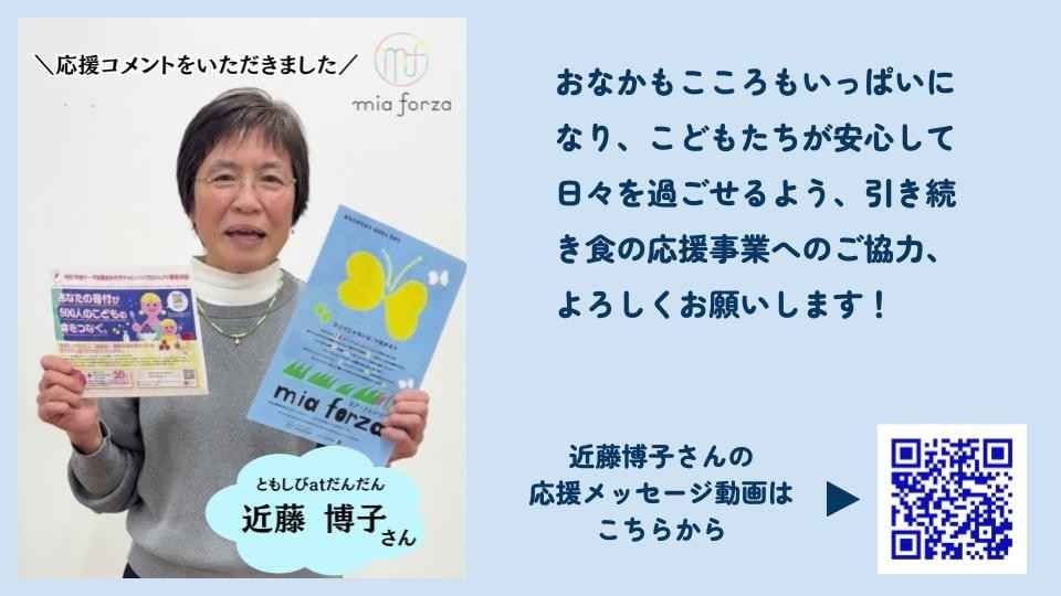 2026-02-15 13:39「こども食堂」の名付け親、近藤博子さんから応援メッセージをいただきました!本プロジェクトに温かなご支援をいただき、心より感謝申し上げます。 皆さまの応援のおかげで、本日時点で60名の方から1,411,314円ものご寄付をいただいており、お一人おひとりの想いの重さを切に感じております。 本プロジェクトの受付期間は2月28日まで続きます。私たちは、この活動を通じて「支え合いの輪」がさらに広がっていくことを願っています。 今回は、「こども食堂」の名付け親であり、多世代の居場所づくりを実践されている(一社)ともしびatだんだんの近藤博子さんより、応援メッセージをいただきました。 https://www.instagram.com/p/DUib2gwgl4R/ ぜひ、近藤さんのメッセージに触れていただき、引き続きシェアやご紹介などの形で、最後まで応援の輪を広げていただけますと幸いです。2026-02-15 13:39「こども食堂」の名付け親、近藤博子さんから応援メッセージをいただきました!本プロジェクトに温かなご支援をいただき、心より感謝申し上げます。 皆さまの応援のおかげで、本日時点で60名の方から1,411,314円ものご寄付をいただいており、お一人おひとりの想いの重さを切に感じております。 本プロジェクトの受付期間は2月28日まで続きます。私たちは、この活動を通じて「支え合いの輪」がさらに広がっていくことを願っています。 今回は、「こども食堂」の名付け親であり、多世代の居場所づくりを実践されている(一社)ともしびatだんだんの近藤博子さんより、応援メッセージをいただきました。 https://www.instagram.com/p/DUib2gwgl4R/ ぜひ、近藤さんのメッセージに触れていただき、引き続きシェアやご紹介などの形で、最後まで応援の輪を広げていただけますと幸いです。
