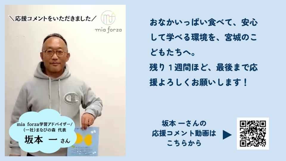2026-02-20 08:22(一社)まなびの森の坂本一さんより応援メッセージをいただきました!本プロジェクトに温かなご支援をいただき、心より感謝申し上げます。 本日時点で65名の方から1,456,314円のご寄付をいただいております。残り1週間ほど、皆さまと共に「こどもたちの未来」を支える輪を広げていければ幸いです。 今回は、mia forzaの学習アドバイザーであり、県内で(一社)まなびの森を運営されている坂本一さんより、応援メッセージをいただきました。 https://www.instagram.com/p/DU8FABKk_rK/ 「地域に必要なひとを地域自らが育て上げる」という信念のもと、長年こどもたちに伴走し続けてきた坂本さん。食の安定が学びの土台となり、ひいては地域の未来に繋がるのではないかと、日ごろから協働させていただいています。 専門的な視点から共に歩んでくださる坂本さんのメッセージをぜひご覧ください。引き続き、応援のシェアやご紹介をよろしくお願いいたします!2026-02-20 08:22(一社)まなびの森の坂本一さんより応援メッセージをいただきました!本プロジェクトに温かなご支援をいただき、心より感謝申し上げます。 本日時点で65名の方から1,456,314円のご寄付をいただいております。残り1週間ほど、皆さまと共に「こどもたちの未来」を支える輪を広げていければ幸いです。 今回は、mia forzaの学習アドバイザーであり、県内で(一社)まなびの森を運営されている坂本一さんより、応援メッセージをいただきました。 https://www.instagram.com/p/DU8FABKk_rK/ 「地域に必要なひとを地域自らが育て上げる」という信念のもと、長年こどもたちに伴走し続けてきた坂本さん。食の安定が学びの土台となり、ひいては地域の未来に繋がるのではないかと、日ごろから協働させていただいています。 専門的な視点から共に歩んでくださる坂本さんのメッセージをぜひご覧ください。引き続き、応援のシェアやご紹介をよろしくお願いいたします!