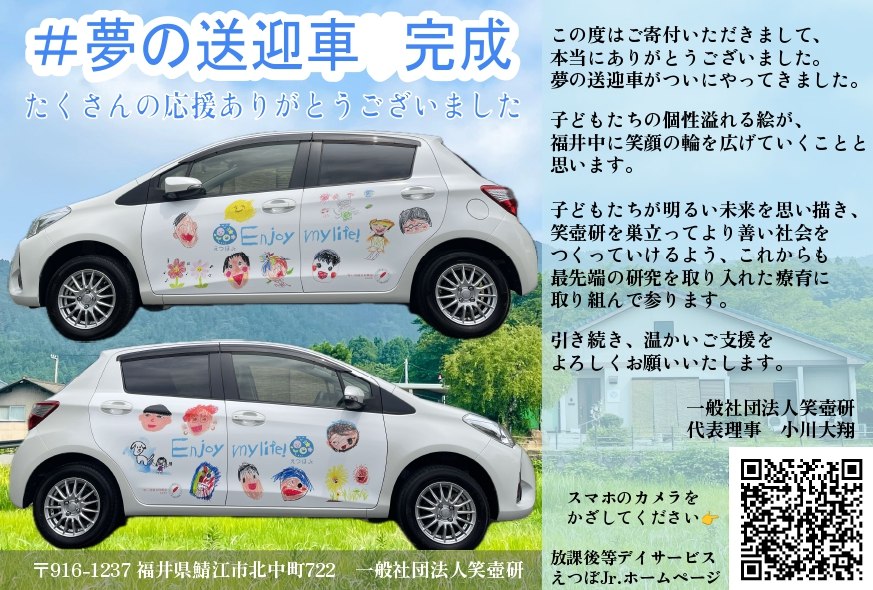この度はご寄付いただきまして、本当にありがとうございました。 夢の送迎車がついにやってきました。 子どもたちの個性溢れる絵が、福井中に笑顔の輪を広げていくことと思います。 子どもたちが明るい未来を思い描き、笑壺研を巣立ってより善い社会をつくっていけるよう、これからも最先端の研究を取り入れた療育に取り組んで参ります。 引き続き、温かいご支援をよろしくお願いいたします。 一般社団法人笑壺研 代表理事 小川大翔