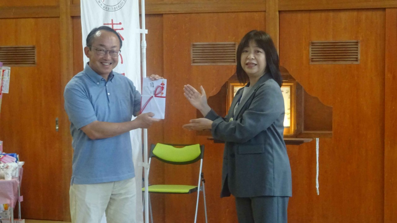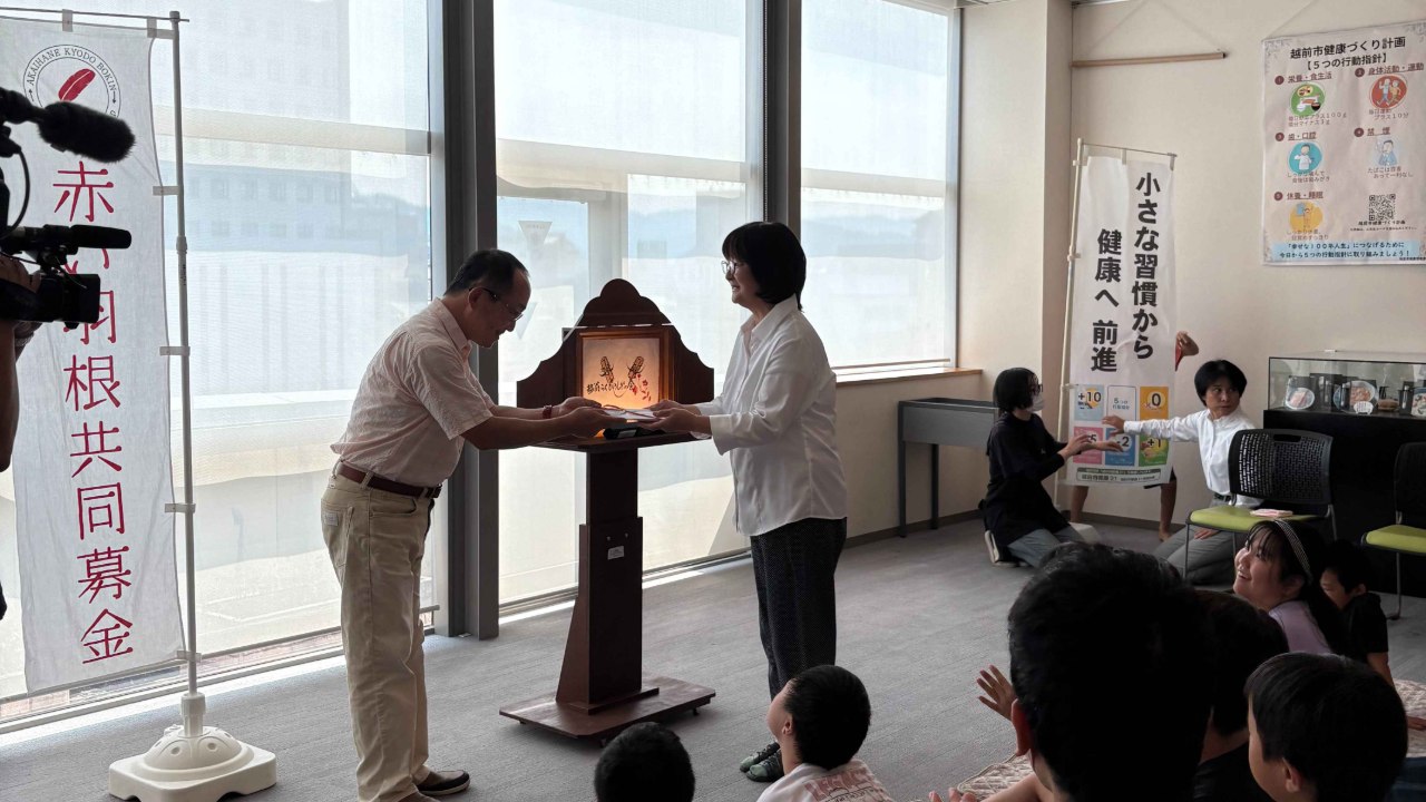 2025-09-03 13:419月3日(水)越前市エコビレッジ交流センターにて贈呈式を行いました!令和7年9月3日(水)、越前市エコビレッジ交流センターにて贈呈式を行いました。 (写真:目録のお渡し 代表2名の方が受け取ってくれました)2025-09-03 13:419月3日(水)越前市エコビレッジ交流センターにて贈呈式を行いました!令和7年9月3日(水)、越前市エコビレッジ交流センターにて贈呈式を行いました。 (写真:目録のお渡し 代表2名の方が受け取ってくれました)