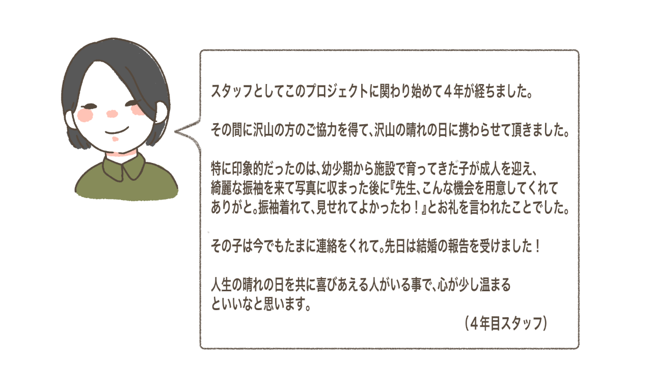 私が施設で働き始めた頃、施設を巣立ち自立している若者が、成人式に晴れ着を着て参加することのハードルの高さに気付かされました。