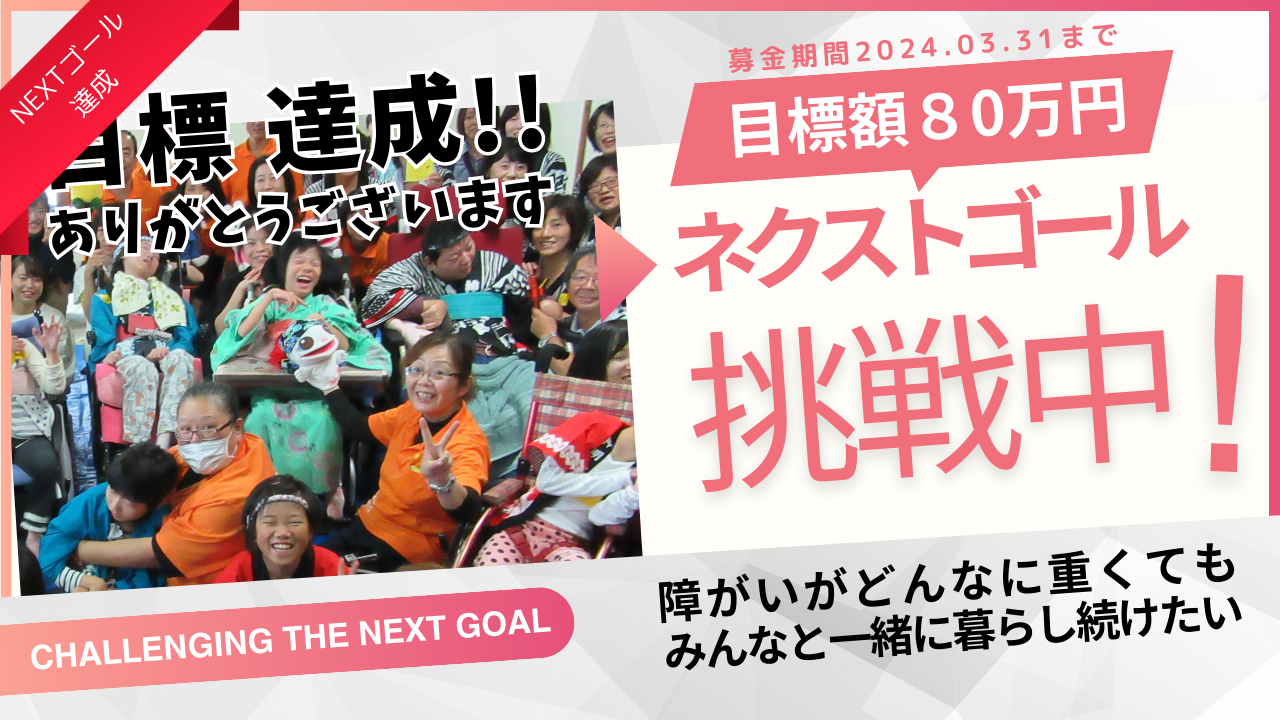 更にネクストゴールとそれを超過してご支援していただきました分につきましては、『映画上映会及びシンポジウムの不足分』 『ホームページ構築費』 『先進地視察研修費』 『自立生活をイメージするためのツアー』 の費用に使わせていただきたいと思っております。
