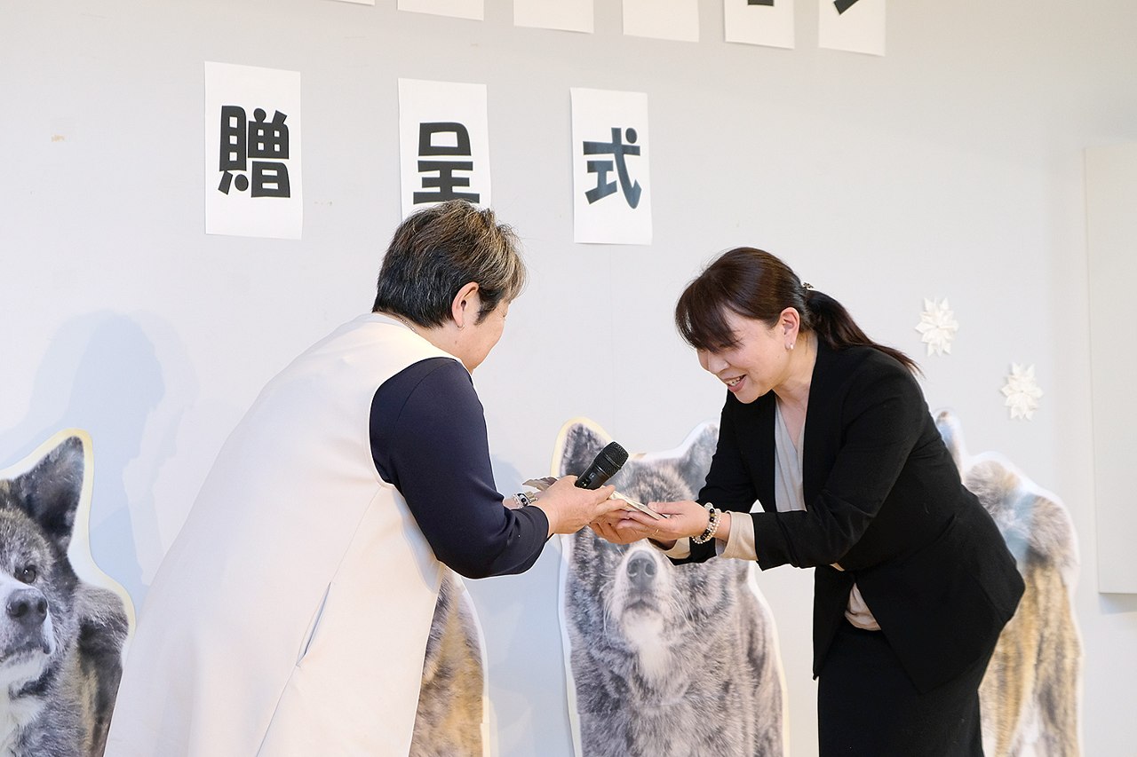 2024年4月15日、大館市観光交流施設 秋田犬の里にて、寄付金の一部で購入した犬用ペットフードの贈呈式を開催しました。