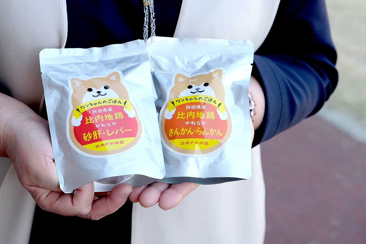 贈呈したペットフードは、比内地鶏を用いた商品の開発と販売、店舗展開等を行う株式会社秋田比内やが製造した「比内地鶏 やわらかシリーズ」。一昨年から同社が開発を進め、イベントを中心に販売しています。